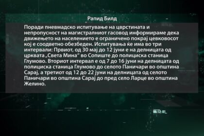 До 22 јуни тестирање на гасоводот Скопје – Гостивар